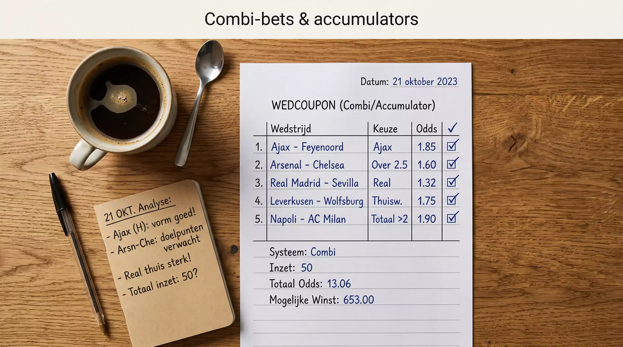 Weinig weddenschappen wekken zoveel opwinding als de combi bet. Een tientje inzetten op vijf wedstrijden en honderden euro’s terugkrijgen als ze allemaal goed vallen — het is het lottogevoel van de sportweddenschap. En net als bij de lotto is de realiteit minder glamoureus dan de fantasie. Accumulators zijn de meest populaire en tegelijkertijd de meest misverstane vorm van sportwedden. Ze bieden spectaculaire potentiële rendementen, maar de wiskundige realiteit werkt meedogenloos tegen je. In deze gids ontleden we hoe combi weddenschappen werken, waarom de marge zich tegen je opstapelt, en hoe je er toch verstandig mee kunt omgaan.